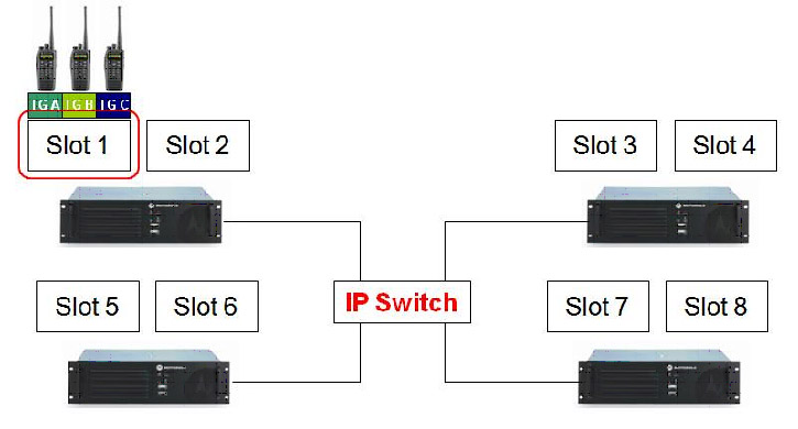采用IP聯網的方式將4臺XIR8200數字中轉臺組成單基站集群通訊系統。最多支持8個語音集群信道和16個數據信道。用戶最多容量可達800個。不需要常規集群系統的控制信道,可以使用全部的8個時隙,不浪費系統的時隙,無需申請及準許機制。當新的呼叫開始時,休閑時隙會轉移到一個新的空閑時隙上,系統通知所有空閑的對講機轉移到空閑時隙上來,原有的空閑時隙轉換為通話時隙,開始在這個通話時隙上中繼語音通信。當通話中止時,通話時隙會通知對講機新的空閑時隙或相關時隙。